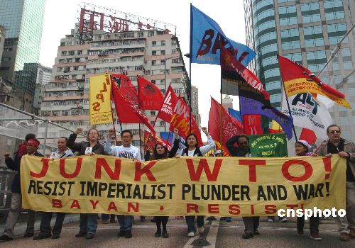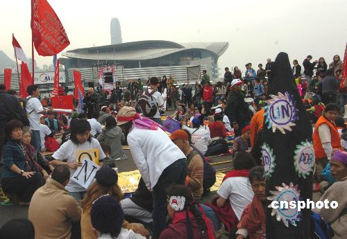 第六次世贸部长级会议13日下午在香港会展中心举行﹐一些外国非政府组织人士在会场外表达诉求。作者:赵振清