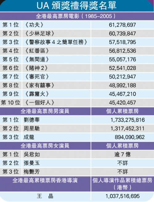 中新网12月14日电 据香港媒体报道,“光影梦魅20年──UA 20年周年派对暨全港最高票房电影颁奖典礼1985-2005”前晚于太古城UA戏院举行。整晚颁发多个奖项,包括1985-2005年十大最高票房电影、最高票房男女演员及全港最高累积票房香港导演。出席艺人有荣获最高票房男女演员的刘德华及吴君如、郑伊健、梁咏琪、任达华、林建岳、林小明等,场面热闹。大会更邀得民政事务局局长何志平及立法会议员霍震霆担任主礼嘉宾。