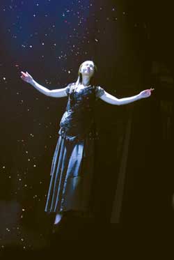 当记者来到《星光大道》拍摄现场的时候,正赶上剧组在拍摄伍谷(陈小春饰)和米露(林心如饰)《相爱》和《结婚》的两场歌舞场面的戏。拍摄地点选在了同济大学分校的小剧场里面,开拍前,导演命令工作人员将所有的窗帘都拉紧,整个剧场里昏暗无比。随着优美旋律的响起,一束光芒照亮了黑色的舞台,身穿黑色礼服的心如从半空中徐徐下落,她随着音乐在空中优美地舞动着,五彩的闪片纷繁地飘落下来,心如就像穿着红舞鞋的美丽舞者,独自静静地舞动着。梦幻的布景,典雅的造型,心如飞舞着从天而降,惊艳了全场。
