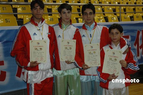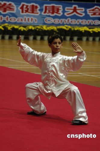 图为古巴十一岁少年GUSTAVO ALDEREGUIA 十九日上午在比赛中获得男子B组四二式太极拳第一名。