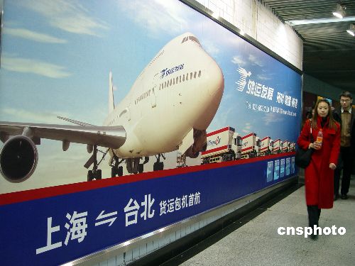 12月18日,上海地铁里打出上海至台北运包机首航广告。酝酿已久的两岸货运包机终于修成正果。 作者:杨明静