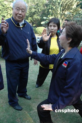 第二届世界太极拳健康大会十二月十八日至二十日在海口举行。图为中国著名杨氏太极拳掌门人、今年八十多岁的杨振铎(左)十九日在海口向来自日本和菲律宾等的国外太极拳爱好者现场辅导授艺。作者:王辛莉