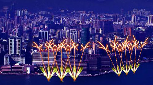 - 压轴一幕“普天同庆”亮起像万花筒般旋转的灯光图案,配合腾飞舞动的灯光效果,象征大家同心合力,为香港这个亚洲国际都会创造更光辉的未来。