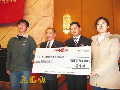 中新网12月21日电 据香港文汇报报道,曾宪梓教育基金会二十日在人民大会堂举行“第二期优秀大学生奖学金”计划2005年度颁奖大会。曾宪梓捐出650万元人民币,资助来自内地32所高校的1,750名品学兼优的贫困大学生。