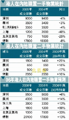 赖国强预期,2006年港人内地置业情况应比较乐观,一手成交量可望达20100宗较今年上升13%,成交金额达120亿元人民币,而二手成交量方面将大幅增加至约4000宗,较05年上升36%,估计涉及的成交金额达19亿元人民币。