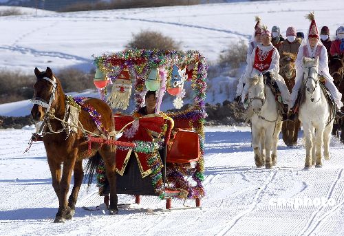 十二月二十二日,在乌鲁木齐丝绸之路滑雪场,一辆装饰“豪华”的马拉雪橇一经亮相便引来众多游客争相乘坐。近日,二00五丝绸之路冰雪风情节正在乌鲁木齐如火如荼的进行当中,乌鲁木齐周边大小滑雪场也使出浑身解术,推出特色冬季旅游项目招揽游客。 作者:刘新
