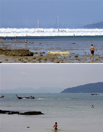 中新网12月23日电 据法新社报道,泰国南部首府甲米市附近海特瑞雷海滩。上图为2004年12月26日印度洋爆发的海啸形成6道巨浪冲向海滩,外国游客纷纷后退。下图为2005年12月12日,海啸过去将近一年后,一艘船在海特瑞雷海滩附近海面上行驶时平静祥和的场景。(春风)