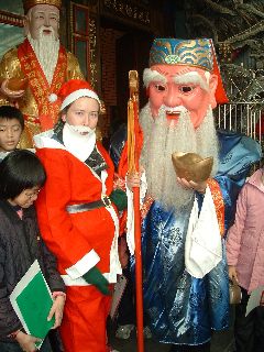 据台湾媒体报道,赶在圣诞节前,以供奉“金身土地公”闻名的宜兰县四结福德庙巧思安排一场外国“圣诞老公公”与本地“土地公”的喜相逢。现场两人先礼后兵,先是互相说“哈啰”,之后就送礼物拼场比人气。“圣诞老公公”逢人送糖果,“土地公”则是“有拜有保佑”,拜求就给红包,一中一西,喜气洋洋。先礼后兵,礼貌问候完就比拚人气,谁也不输谁。