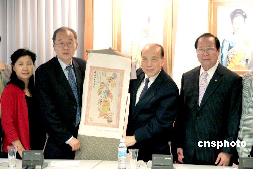 中国国务院侨办副主任刘泽彭二十三日下午在曼谷率团拜访泰国中华总商会,赞赏这个大侨团创办华文学校、传承中华文化,表示“愿意在师资、教材等各方面尽一切力量提供帮助”,支持当地华文教育的发展。图为刘泽彭(左二)向泰国中华总商会副主席陈庆波(右二)赠送丝绸纪念画。作者:罗钦文