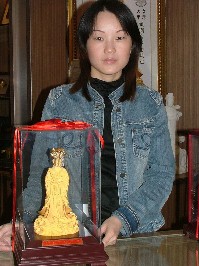 中新网12月26日电 台中县大甲镇澜宫于今年初展出重7260两的黄金妈祖,最近开始对外出售迷你黄金妈祖,此举广受信众欢迎,平均每天卖出一尊妈祖。