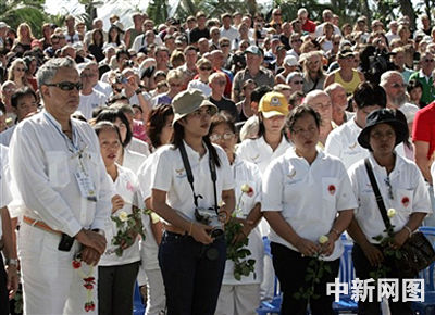 12月26日,大批海啸幸存者及遇难者家属聚集到泰国普吉岛纪念2004年12月26日海啸发生一周年。人们把鲜花抛向大海,互相拥抱,擦去眼泪,一起纪念在这次海啸中丧生的遇难者。