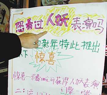 该美容院一位美容小姐称,在店内消费100元钱就可以得到一张票。这张票是公司年底活动的时候使用的,活动当天会有“人妖”表演。公司邀请的“人妖”都是真的“人妖”,表演的项目基本是唱歌、跳舞之类的。很多人都对“人妖”表演感兴趣,票现在已经剩得不多了。