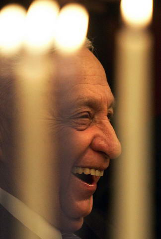 中新网12月28日电 据路透社报道,12月27日,以色列总理沙龙参加在他耶路撒冷办公室附近举行的“光明节”,并点燃了“光明节”蜡烛。图为沙龙在点燃的蜡烛前开心的微笑。