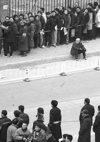 28日10时许,数千市民聚集在天通苑北一区1号楼附近一座矮楼前,排起队伍。楼上贴着几个大字——“崇文区拆迁安置居民对接选号现场”,这里便是天通苑经济适用房的放号现场。