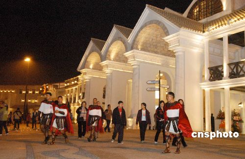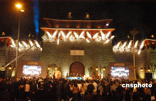 中新社澳门十二月三十一日电 (记者 黄鸿斌)三十一日晚,澳门渔人码头灯火璀璨,巍峨的仿古建筑“唐城”下鼓乐喧天。澳门特别行政区行政长官何厚铧、中央人民政府驻澳联络办公室副主任何晓卫及国家旅游局副局长孙纲为渔人码头开幕主持开幕庆典与亮灯仪式。