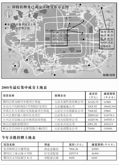 2005年最后一批土地交易刚刚落下帷幕,1月9日,北京市土地整理储备中心又将推出今年第一批公开挂牌交易的土块,共计三宗土地,其均位于城区内。目前从三宗的质量来看,朝阳区工体北路4号院住宅及配套用地预计会引起业内注意,安贞桥综合大厦用地及朝阳区太阳宫新区E区非配套公建两块地,虽然位置很好,但是体量较小会让其的吸引力大打折扣。