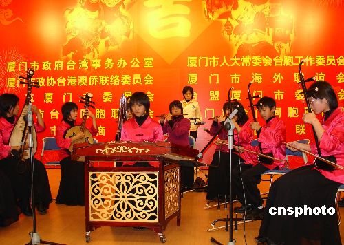 中新社厦门一月三日电 (记者 杨伏山)二00六年厦门市海峡两岸同胞迎新春茶话会,三日在与金门隔海相望的厦门国际会展中心热烈举办。金门县立“金城国民中学”民乐团专程莅厦为与会两岸各界人士献上民乐合奏节目,博得场上阵阵掌声。