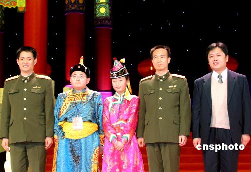 一月七日,中国文学艺术界联合会规模盛大的“百花迎春——中国文学艺术界2006年春节大联欢”在北京奥体中心体育馆隆重举行,十一个文艺家协会的文艺家和艺术工作者们共同联欢。图为内蒙古四子王旗“神六”希望小学的学生在联欢会上荣幸地与“神六”宇航员费俊龙、聂海胜合影留念。作者:张勤