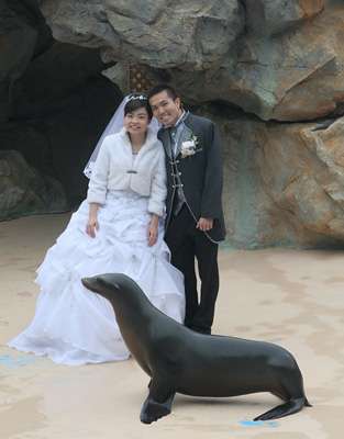 中新网1月9日电 据香港大公报报道,香港海洋公园去年十一月推出八款结婚套餐后,两对新人昨(八日)终于在海豚伴舞、与海狮拍照和海豹祝福下圆婚。对于成为海洋公园二十九年来首个婚礼的主角,而且可以跟各种海洋公园的招牌动物近距离接触,两对新人都异口同声表示,感到很特别和很高兴。