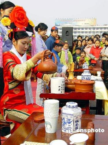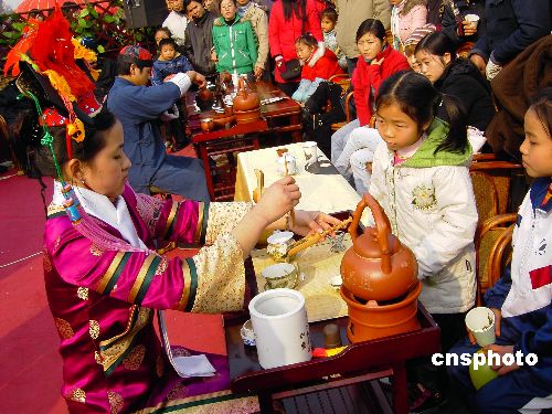 1月8日,湖北宜昌市举办西陵新春庙会,太极茶道宜昌分店的两位茶艺师身着清代格格服饰在庙会上表演精彩的宫廷茶艺,吸引了许多市民。据悉,清代宫廷茶是清代皇帝和宫廷大臣们的一种皇家饮茶方式,不仅泡茶工艺讲究,对茶叶产地等十分考究。作者:刘君凤