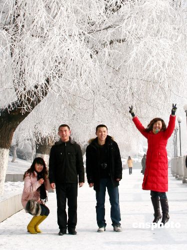 2006年1月11日,许多国内外游客在吉林松江中路观赏雾凇美景。当日,雾凇再度降临吉林,为刚刚开幕的中国吉林国际雾凇冰雪节增添了喜庆气氛。作者:朱万昌