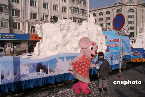 1月16日,第二届哈尔滨·太阳岛雪雕大巡游正在进行,6辆装载着“东君出巡”、“广岛城”、“金鸡报晓”等历届太阳岛雪博会精品的微缩雪雕花车,从太阳岛出发,去松北区政府、经三大动力、走和平路,红旗大街在南岗区天主教堂广场上举行了会歌演唱、趣味问答、与雪雕合影、现场抽奖等活动,吸引了数以千计的市民和游客。据了解,雪雕巡游明天将从哈市双城、阿城、最后向大庆进发,1月21日结束。 作者:姚庭山
