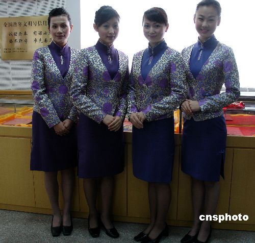 有别于去年张扬的黄色,厦航今年空姐服装改走典雅制服的路线。这款两件套的中式服装融入了传统中式服装与空姐制服的元素,里面为一件紫色及膝旗袍,外面则是一件织锦缎的明黄色外套,外套上绣有紫色祥云和团花图案,象征春节的吉祥圆满。整套服装色彩协调,典雅而不刻板,喜庆而又庄重,个性却不张扬,传统融合着时尚。