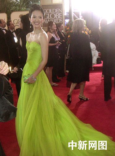 金色当道的金球奖,金色似乎不受青睐,众女星仍纷纷亮出各种颜色的礼服争奇斗艳,尤其是入围剧情类最佳女主角的章子怡,一袭及地苹果绿礼服亮相,惊艳全场,连乔治·克鲁尼都特地前来亲吻章子怡的脸颊。虽然角逐最佳女主角落马,章子怡在好莱坞的魅力却无法阻挡。
