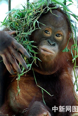 1月13日,一只一岁的大猩猩在印尼南加里曼丹省临时动物保护所的草地上玩耍。联合国和许多非政府环境组织决定联合保护该地日益减少的大猩猩。