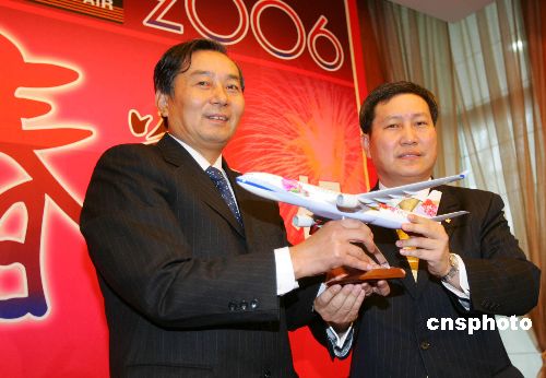 一月二十日,二○○六年两岸春节包机拉开序幕。上午十点三十分,中华航空公司的台北到上海CI-585航班顺利抵达上海浦东国际机场,将于中午满载今年首批返乡台胞回家过年。图为两岸民航业代表在浦东机场互赠礼物。作者:汤彦俊