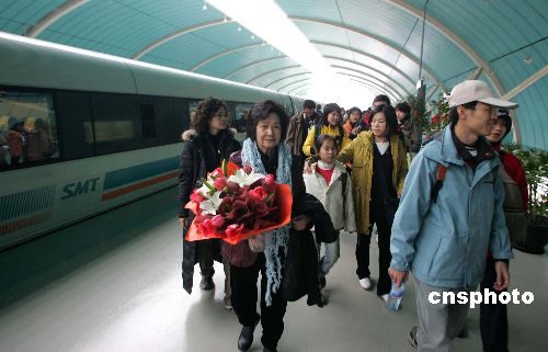 一月二十日,搭乘二00六年度两岸春节包机首发航班飞抵上海的台胞,免费乘坐磁悬浮列车进入市区。他们不仅体验能“极速魅力”,也感受到上海人的一份新年祝福。作者:潘索菲