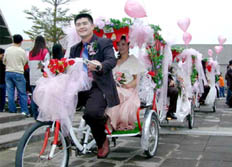 台南科学园区科技人集团结婚,采复古仪式,由新郎官踩黄包车载新娘子到婚礼场地。(来源:台湾《中国时报》 作者:郑纬武)