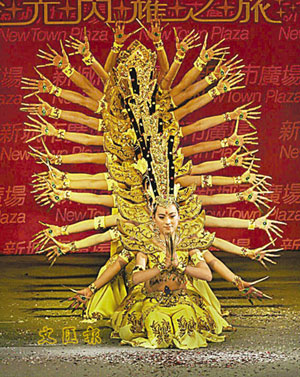 其中最为瞩目乃《千手观音》敦煌舞表演,14位聋哑人士穿上金光闪闪的舞衣,模仿甘肃敦煌莫高窟中壁画的千手观音,加上丰富的手姿及舞步,活现盛唐精湛舞蹈艺术,并为观众带来祝福。