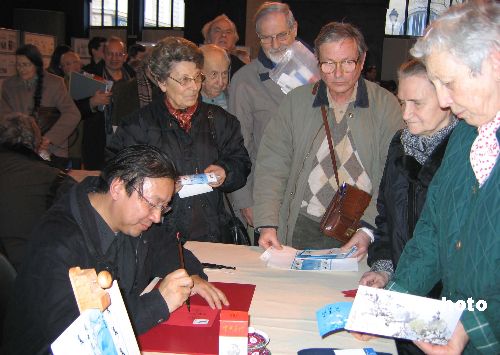 法国邮政总局推出的中国生肖狗年邮票1月23日在法国正式发行。图为在此前举行的邮票首发式上,法国集邮爱好者排长队请该邮票的作者、旅法中国艺术家李中耀在邮票上签字留念。作者:程励