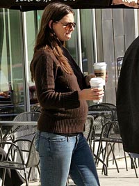 中新网1月24日电 据外电报道,前不久,好莱坞备受关注的孕妇凯蒂·赫尔姆斯在光天化日之下公然亮相于好莱坞附近的一家咖啡店,身边没有汤姆·克鲁斯的陪伴。只见她穿着棕色的毛衣,普通的牛仔裤,戴着墨镜,不施脂粉的脸没有以前陪同阿汤哥公开亮相时那么光鲜亮丽,看上去和一般的孕妇没有什么区别。她手持两杯热饮,不知道另一杯是不是给阿汤哥。