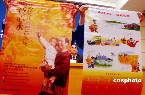 | 一月二十四日,新任国家环保总局局长周生贤在国务院举行的新闻发布会上,向大家介绍两幅宣传年画,第一张是让松花江沿岸人民喝上放心水,第二张叫“告别污染,快乐过年”。他介绍,松花江、黑龙江监测断面水中硝基苯的浓度已经符合国家标准。专家认为今春解冻期松花江大面积水质不会超标,各江段及沿岸鱼塘的鱼可以放心地食用;沿江两岸地下水也已符合国家标准,可以安全饮用;用松花江水进行灌溉不会影响农作物的生长。春节来临之际,两幅带着美好祝愿的年画已经送到了松花江沿线。作者:王丽南