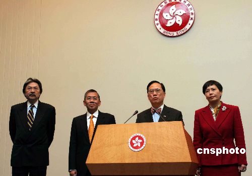 香港特区行政长官曾荫权24日会见新闻界,宣布中央人民政府已根据他的提名,任命王永平(左二)为工商及科技局局长、俞宗怡(右一)为公务员事务局局长。曾荫权同时宣布委任曾俊华(左一)为行政长官办公室主任。作者:谭达明