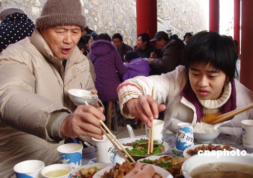 一月二十五日,三峡库区奉节县永安镇小区移民在享用团年饭。春节莅临,三峡库区重庆市奉节县永安镇近千个移民家庭欢聚在清静庵小区,共话和谐幸福生活,共享团年饭。作者:周会