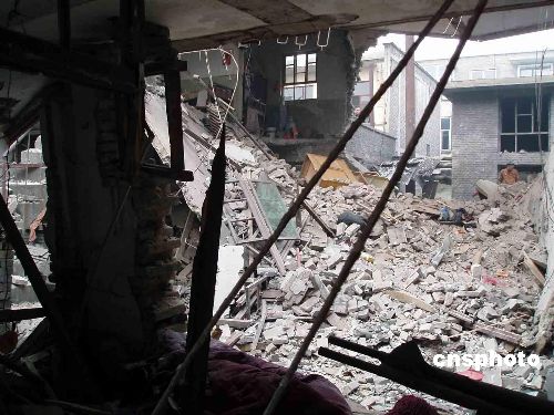 人们在现场看到,爆炸院落的二层小楼前后围墙被炸穿,楼顶板断裂,地上全是碎砖块和玻璃渣,消防人员正在紧张搜救被困人员,当地政府组织二十多名民工在清理现场。