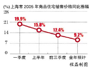 《报告》中的统计数据显示,上海市2005年商品住宅销售价格四个季度逐渐回落,尤其是宏观调控后,涨幅从一季度19.9%涨幅的高位逐步拉低,预计全年商品住房销售价格比上年上涨9.2%,普通商品住房销售比重达到75%以上。