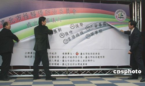 一月二十六日,台北市市长马英九(右二)揭下写有“袭胸”、“强吻”、“不当暴露”等性骚扰行为的纸页。当日,台北市政府成立性骚扰防治委员会,以遏制社会上不断出现的性骚扰现象,台北市市长马英九并担任该委员会主任委员。作者:曾嘉