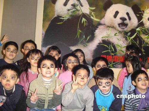 20名小学一、二年级学童,二十六日上午到动物园观赏野生熊猫纪录照片,可能是因为熊猫照片太可爱,小朋友当场学起穿著熊猫道具服的工作人员的动作,扮起熊猫的模样,为求扮相逼真,小朋友两两一组,拿黑色彩绘笔帮对方画上黑眼圈、黑鼻子,手里拿着竹子模仿熊猫进食。 ||;