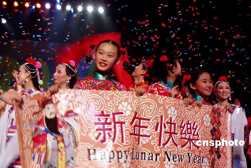 好似贺岁娃娃的美国洛杉矶华人舞蹈学校的小姑娘,在好莱坞新年联欢晚会上喜迎中国农历狗年来临。作者:贾国荣