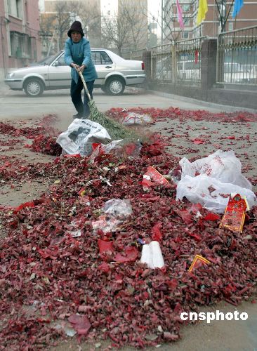 一月二十九日清晨,一位清洁工正在清除市民们燃放鞭炮后的烟花垃圾。北京市燃放鞭炮放开后,市民们的燃放热情空前高涨。 作者:史利