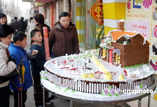 1月29日年初一,安徽淮北一家西点精品屋制作了一个直径1.5米的大蛋糕,蛋糕上精心制作了108只形态各异的小狗,寓意狗年旺旺,吸引了众多市民驻足观赏。作者:泰峰