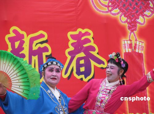 2006年2月2日,正月初五,广西河池市文化广场上,来自该市金城江各个社区的演员们载歌载舞喜迎新春,其中具有浓郁壮乡特色的彩调剧得到了很多市民的喜爱。作者:桂鸿