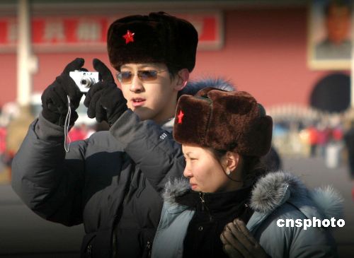 2月3日,北京天安门广场上大风凛冽,一对青年男女戴着厚实的雷锋帽在广场上游玩。与人们阔别已久的雷锋帽,如今重新成为年轻人的新时尚。作者:廖攀