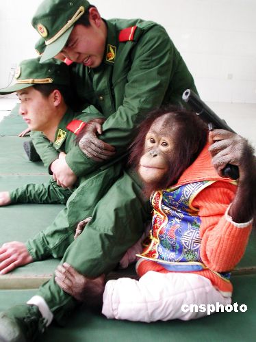 | 2月4日中午,武警浙江省总队温岭市中队训练场上迎来了一位特殊的客人:杭州野生动物世界的动物明星红猩猩“ 三毛”,头一回闯军营的“ 三毛”,竟抢走了正在擒敌格斗训练的一位武警战土身上的一支仿真训练“手枪”,逗得在场武警官兵和消防战士们的直笑。当天,温岭市动物园组织旺旺狗等一群动物到驻地武警、消防部队营区,给春节坚守岗位战士们表演,从杭州野生动物世界客串到温岭市动物园的动物明星红猩猩“三毛”,由饲养员抱着也光顾军营。作者:江勇兵