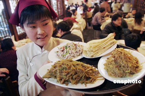 2月4日,北京市一餐厅服务员正忙着给顾客上春饼。当日是“立春”,北京人有吃春饼“咬春”的习俗,临近中午,人们纷纷涌向专营“春饼”的餐厅,顿时家家都出现人满为患,人们借着“咬春”这个说法,感受春的气息。作者:陈晓根