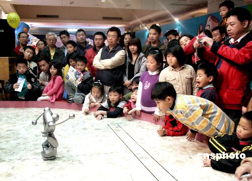 台北“机器人教育展”目前正在信义区新光三越举办。图为民众五日在欣赏机器人表演,小朋友们更是露出痴迷的神情。 作者:黄少华